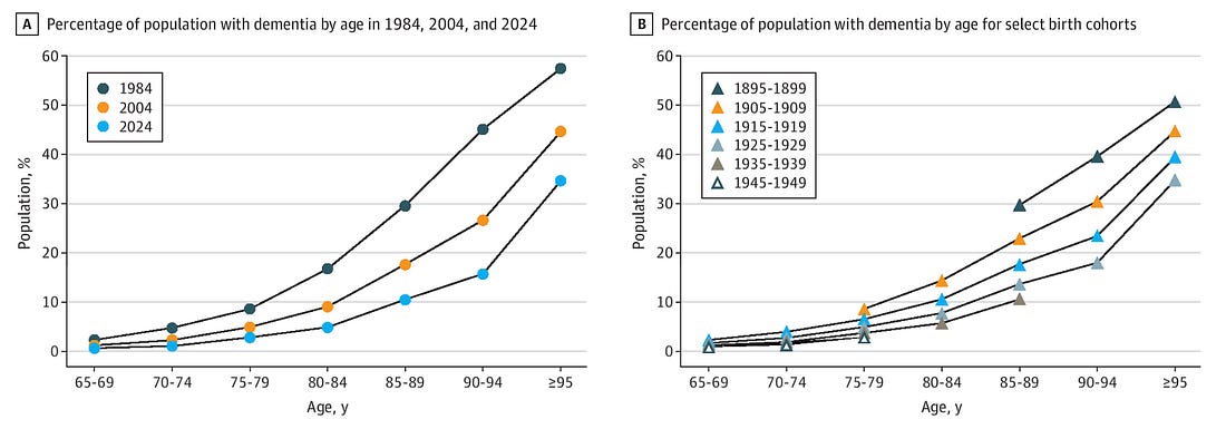 When you get old, your chance of dementia is two-thirds lower than it used to be 40 years ago, reports The Doomslayer. But there are so many more old people alive today than there were 40 years ago, that the fraction of Americans with dementia hasn’t fallen: