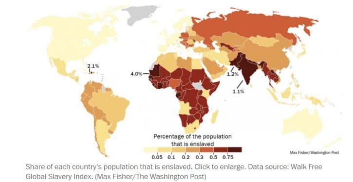 A decade ago, slavery was common in more nations than today, as you can see from the map of the world toward the top of this blog post, which shows nations with higher frequencies of slavery shaded in darker hues (reflecting slavery rates back then).